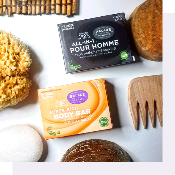 Les artisans de Balade en Provence créent un mélange d'huiles naturelles de la plus haute qualité et de riches ingrédients biologiques, tels que l'huile de pépins de raisin, l'huile de coco, l'huile de colza, le beurre de karité et l'argile française pour fabriquer nos barres.